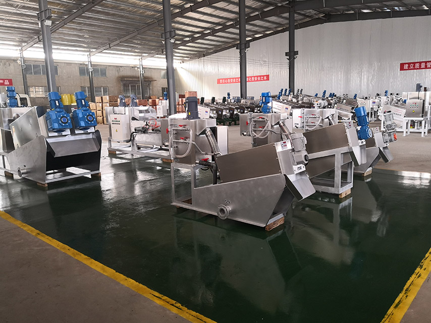 2、脫水:經(jīng)過濃縮的污泥隨著螺旋軸的轉(zhuǎn)動不斷往前移動;沿泥餅出口方向,螺旋軸的螺距逐漸變小,環(huán)與環(huán)之間的間隙也逐漸變小,螺旋腔的體積不斷收縮;在出口處背壓板的作用下,內(nèi)壓逐漸增強,在螺旋推動軸依次連續(xù)運轉(zhuǎn)推動下,污泥中的水分受擠壓排出,濾餅含固量不斷升高, 終實現(xiàn)污泥的連續(xù)脫水。
