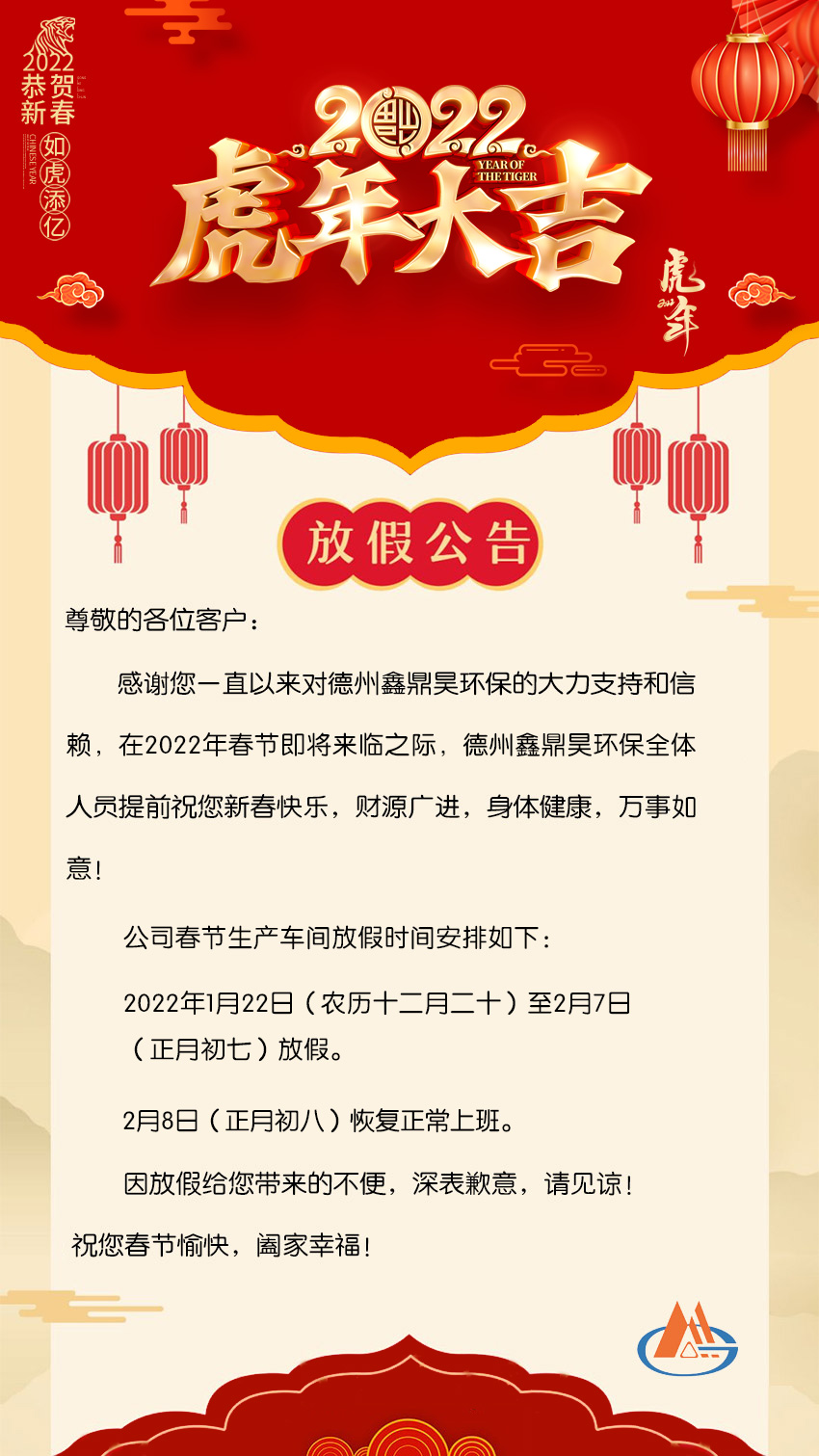 感謝您一直以來(lái)對(duì)德州鑫鼎昊環(huán)保的大力支持和信賴(lài),在2022年春節(jié)即將來(lái)臨之際,德州鑫鼎昊環(huán)保全體人員提前祝您新春快樂(lè),財(cái)源廣進(jìn),身體健康,萬(wàn)事如意!